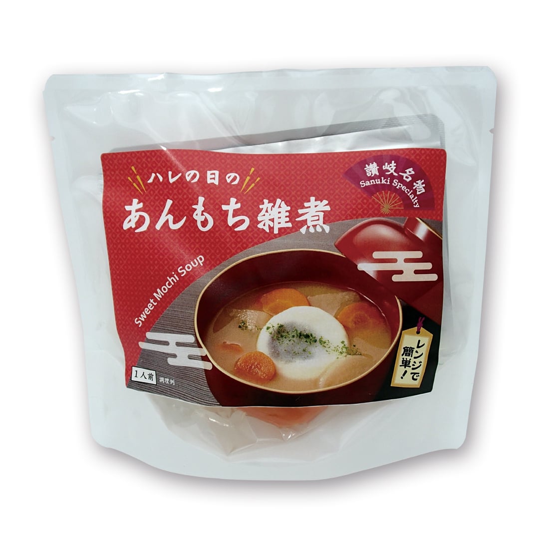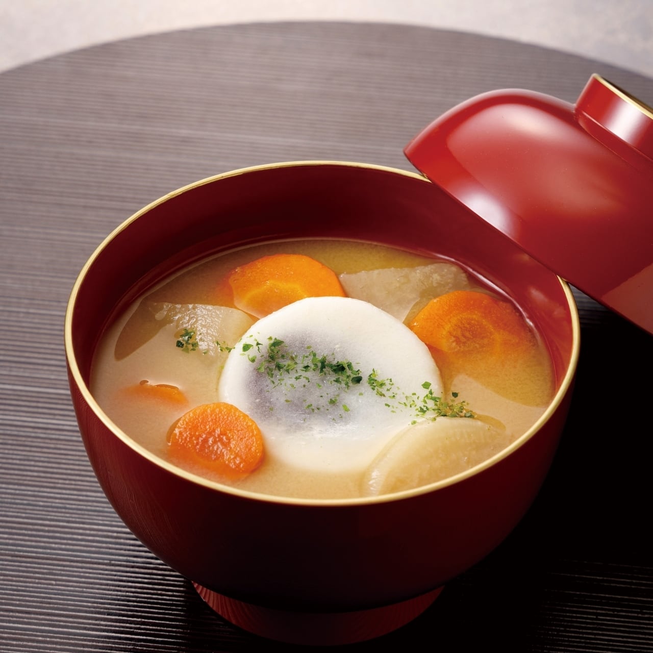 原材料:調味液[米みそ(国内製造)、しょうゆ(小麦・大豆を含む)(国内製造)、食塩、砂糖、米発酵調味料、かつお削り節、かつお節エキス、酵母エキス、昆布エキス/酒精、甘味料(甘草)、着色料(ビタミンB2)、アルコール、調味料(アミノ酸等)]、具[にんじん、大根、白だし(小麦・大豆を含む)/アルコール、調味料(アミノ酸等)]、あん入りもち[もち(水稲もち米(国内産)、マルトース、水あめ)、あん(小豆、砂糖、還元水あめ、寒天)/トレハロース]、青さ